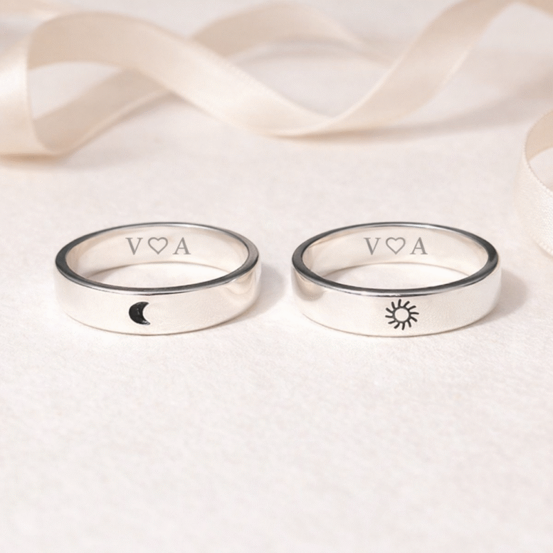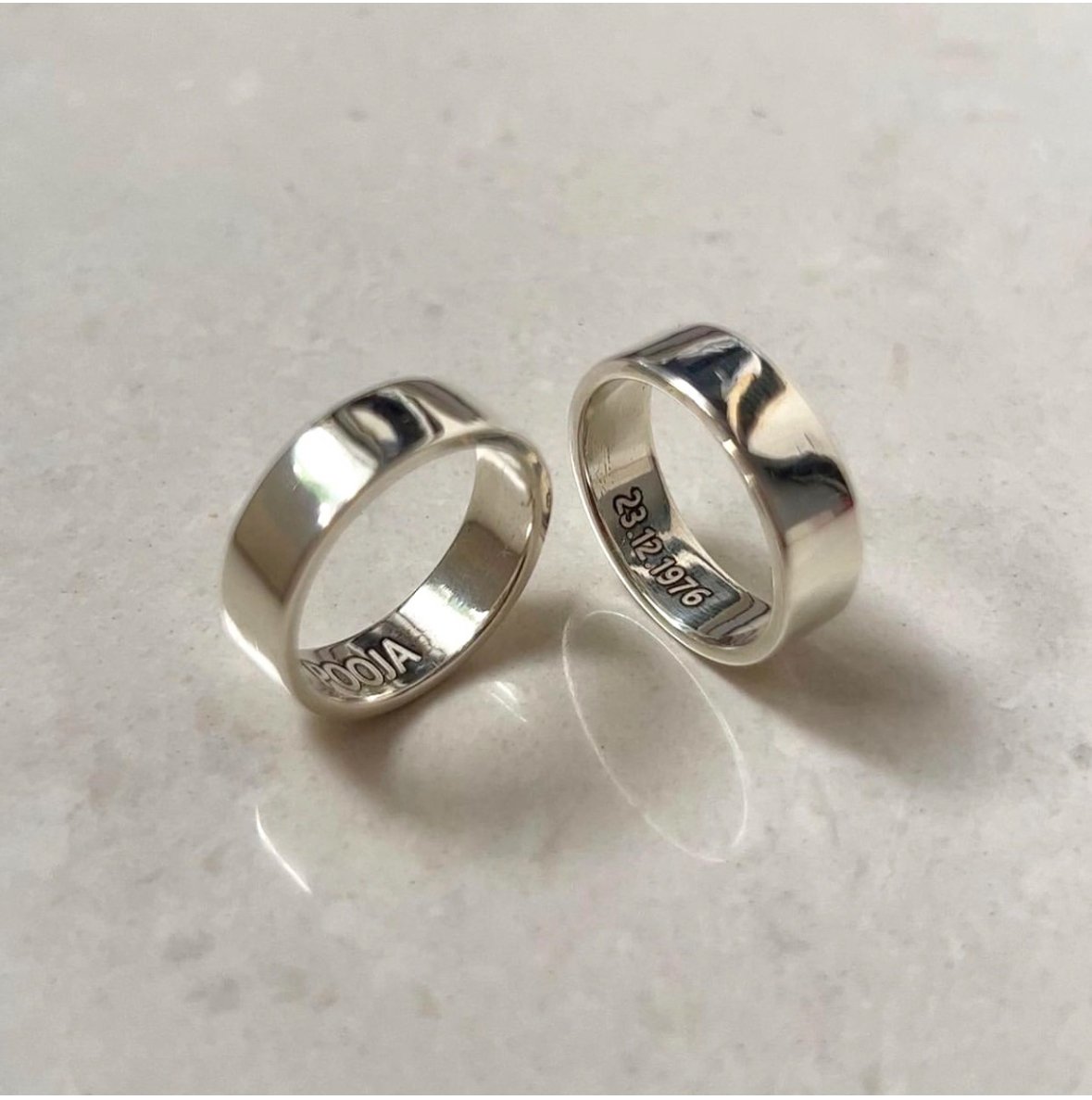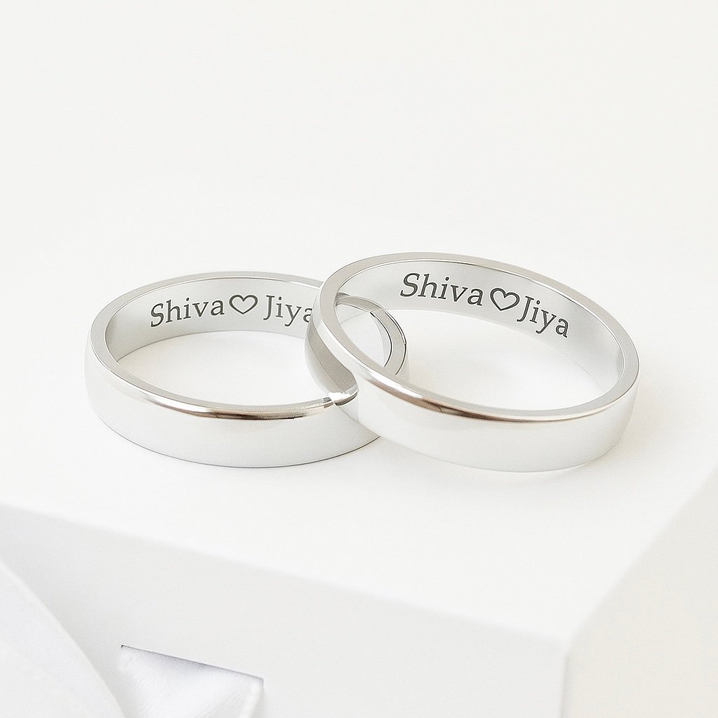 Celebrate your special bond with these stunning 92.5 sterling silver couple rings, crafted for enduring love and style. Featuring a sleek, adjustable design, these rings are available in all sizes, including the standard ones, ensuring a perfect fit for every couple. Each ring is thoughtfully engraved with a personal touch—ideal for customizing with a name or date, like the “23.12.1976” and “POOJA” seen here—making them a heartfelt keepsake.