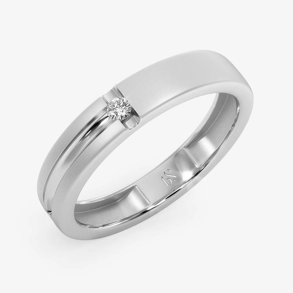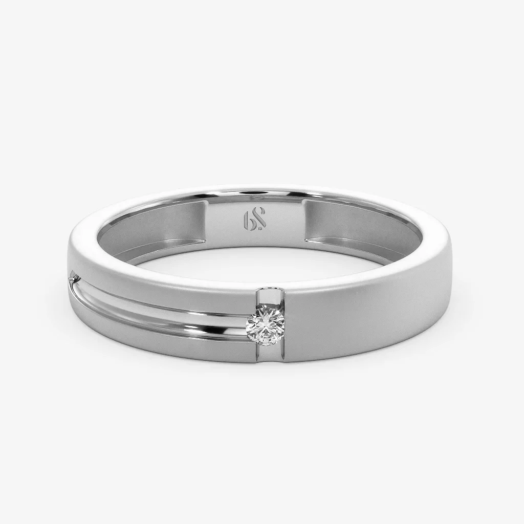 This 925 sterling silver Minimalist Diamond Band boasts a sleek, polished finish with a single round-cut diamond, flush-set for a smooth, modern look. A subtle channel groove runs alongside the diamond, adding a geometric flair, while the interior is engraved.