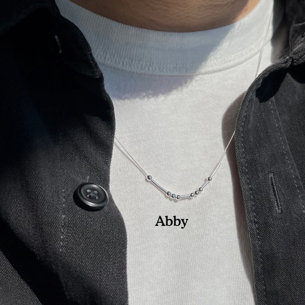 Discover the perfect unisex Morse Code Necklace, a stylish and meaningful piece that blends elegance with personalization. Crafted with a sleek metal chain and accented with metal bars and beads, this necklace encodes your chosen message—such as “Abby”—in Morse code, making it a unique reflection of your personality. Fully customizable with names, initials, or short words (up to 5 characters), it’s an ideal gift or self-treat.