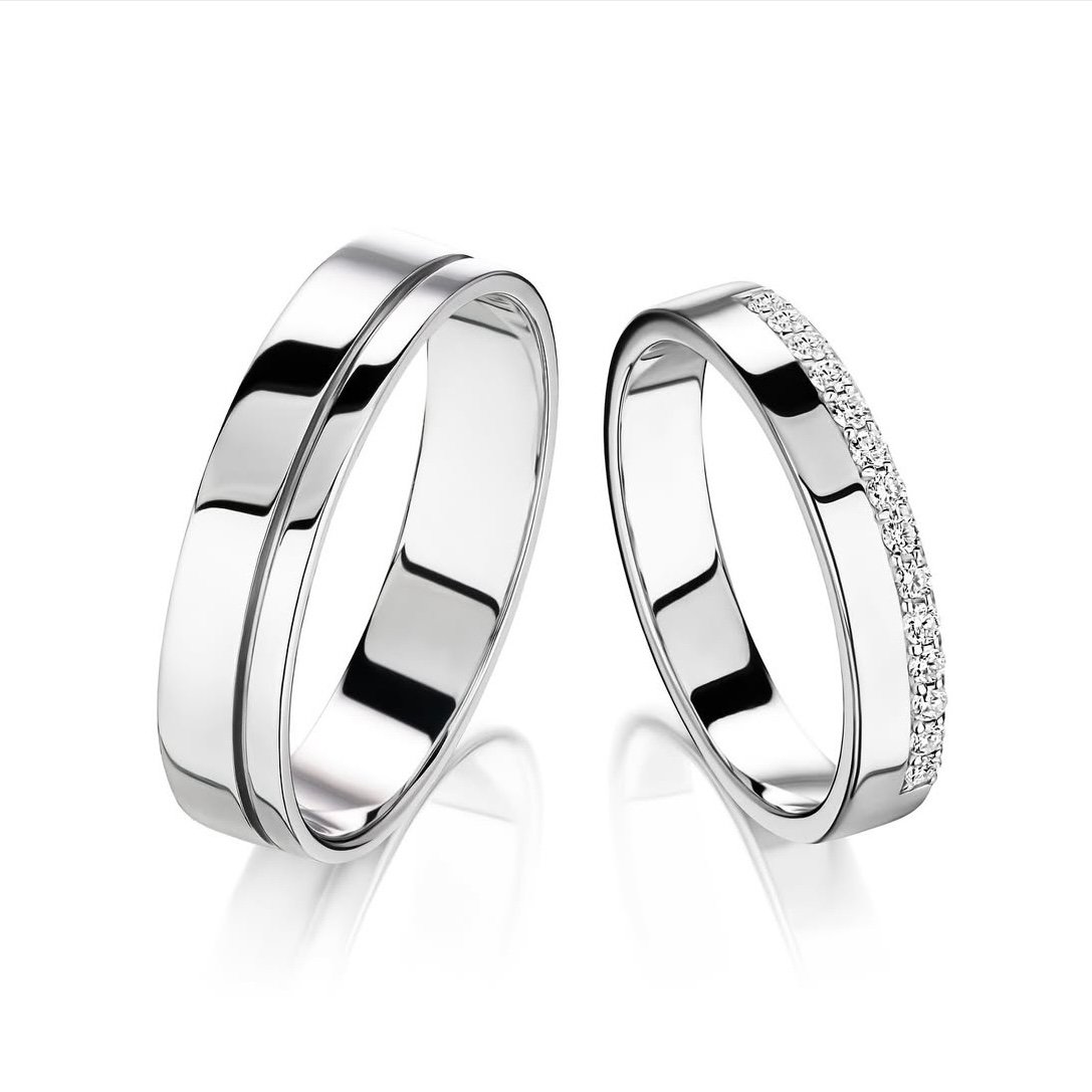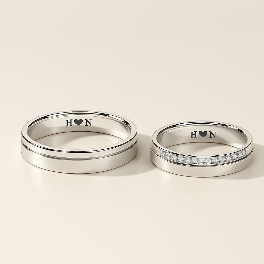 Discover our 92.5 sterling silver couple ring set, featuring a classic plain band and an elegant ring with sparkling gemstones. Both rings offer custom engraving for a personal touch, making them ideal for gifting on special occasions.