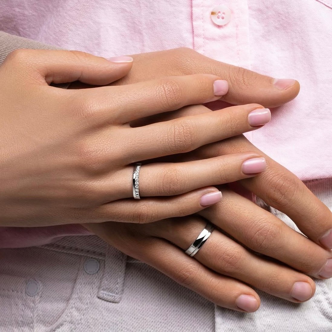 • Ring 2: Similar in material but featuring a row of small, sparkling gemstones embedded along the top edge. The image suggests these could be diamonds or cubic zirconia, adding a touch of elegance and sparkle.