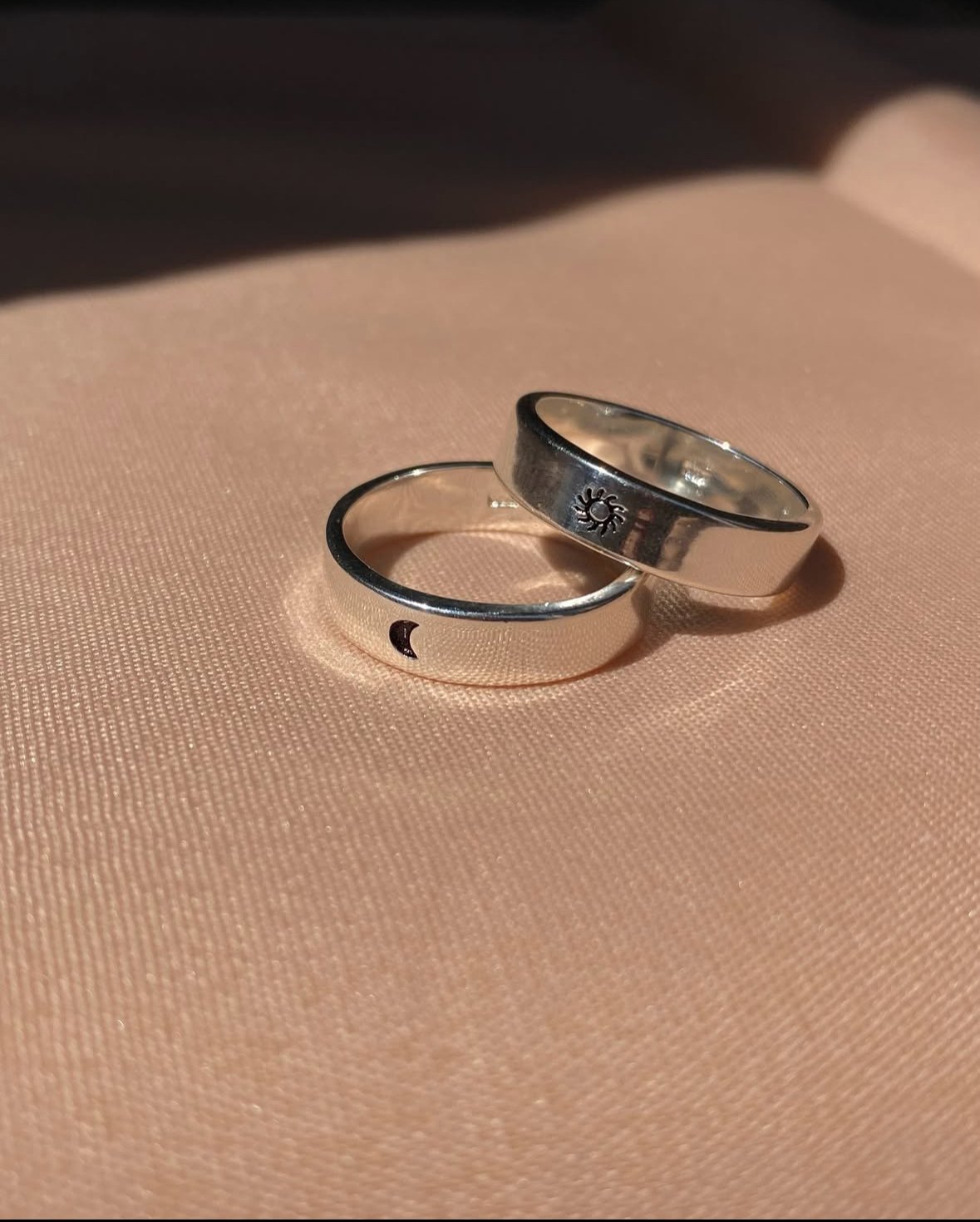 One ring features a delicate moon engraving, representing calm, care, and quiet strength, while the other carries a radiant sun motif, symbolising warmth, protection, and endless energy. Together, they tell a story of love that stays constant through every phase of life.