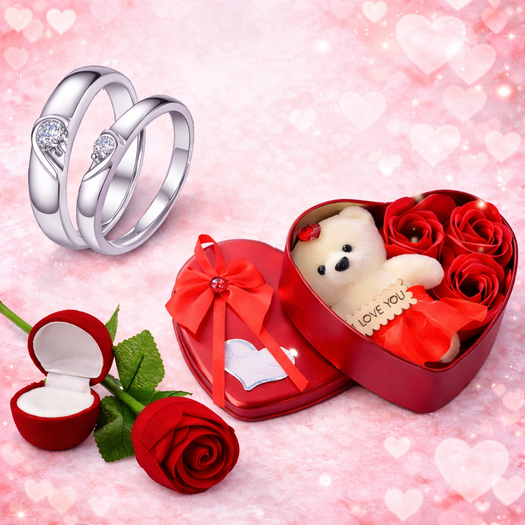 “A perfect Valentine’s combo to say ‘I Love You’ without words — Couple rings, a premium ring box, and a heart box filled with roses & a cute teddy.”❤️